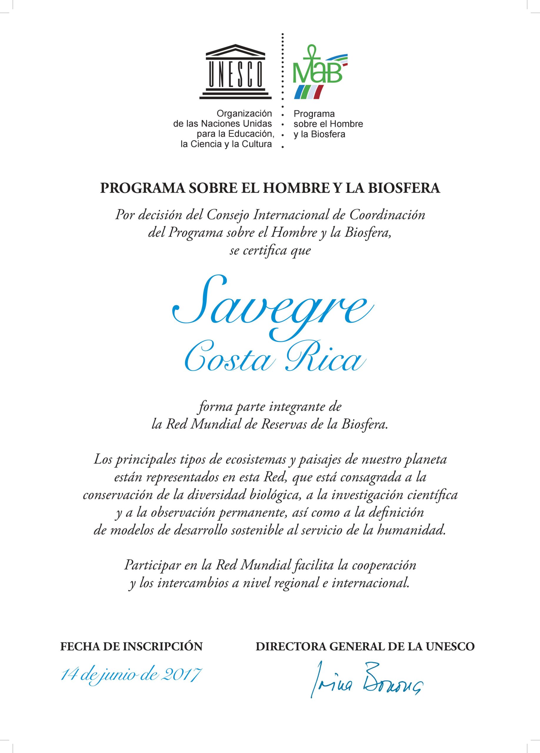 El 14 de junio del 2017 en la reunión del Comité Consultivo Internacional del Programa MaB de la UNESCO, se declara la Reserva de Biosfera Savegre y entró a la red mundial de reservas de biosfera y se convirtió en la cuarta reserva de biosfera para Costa Rica.