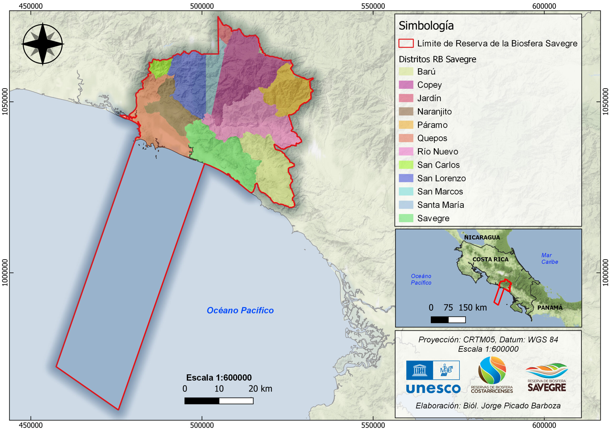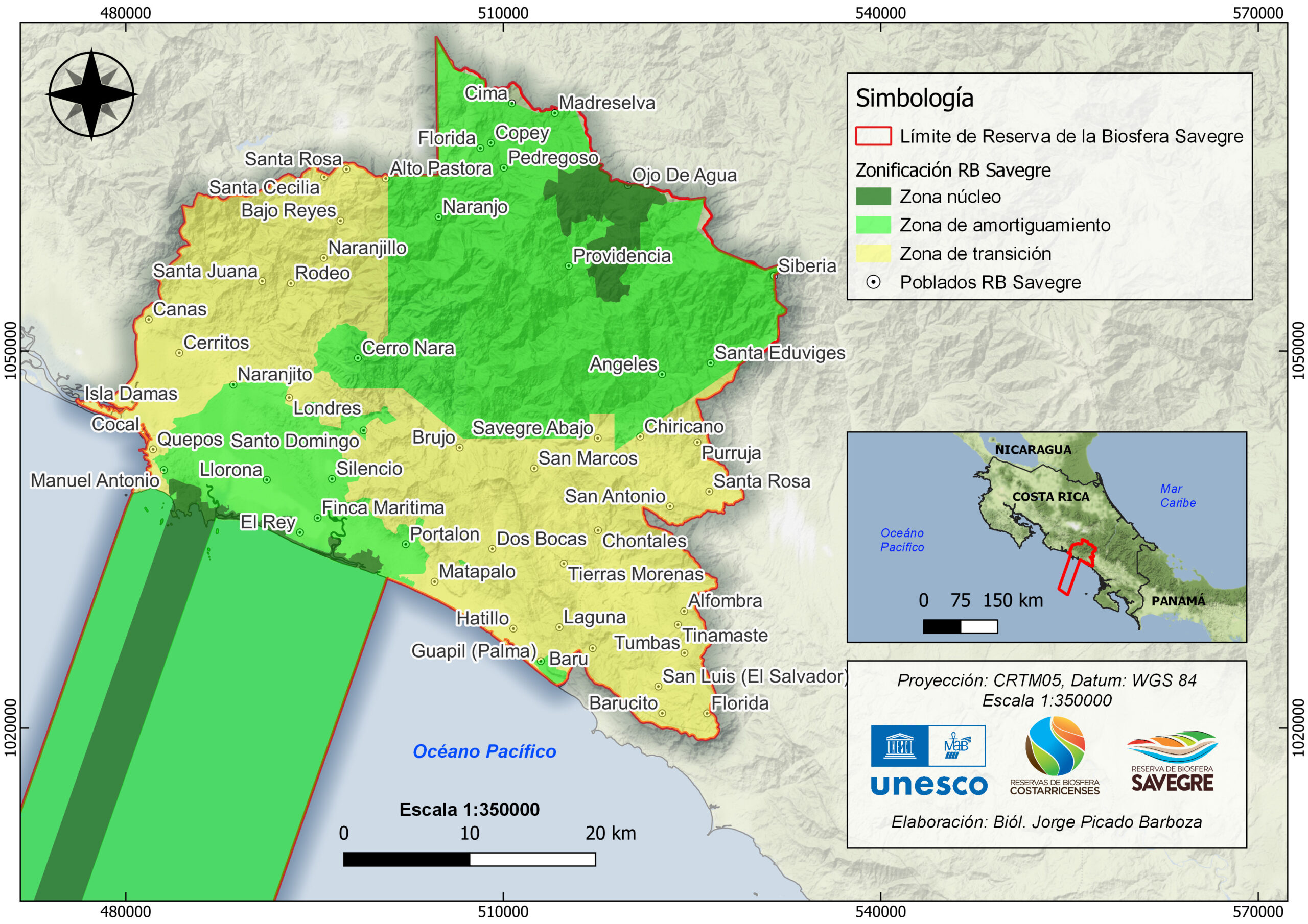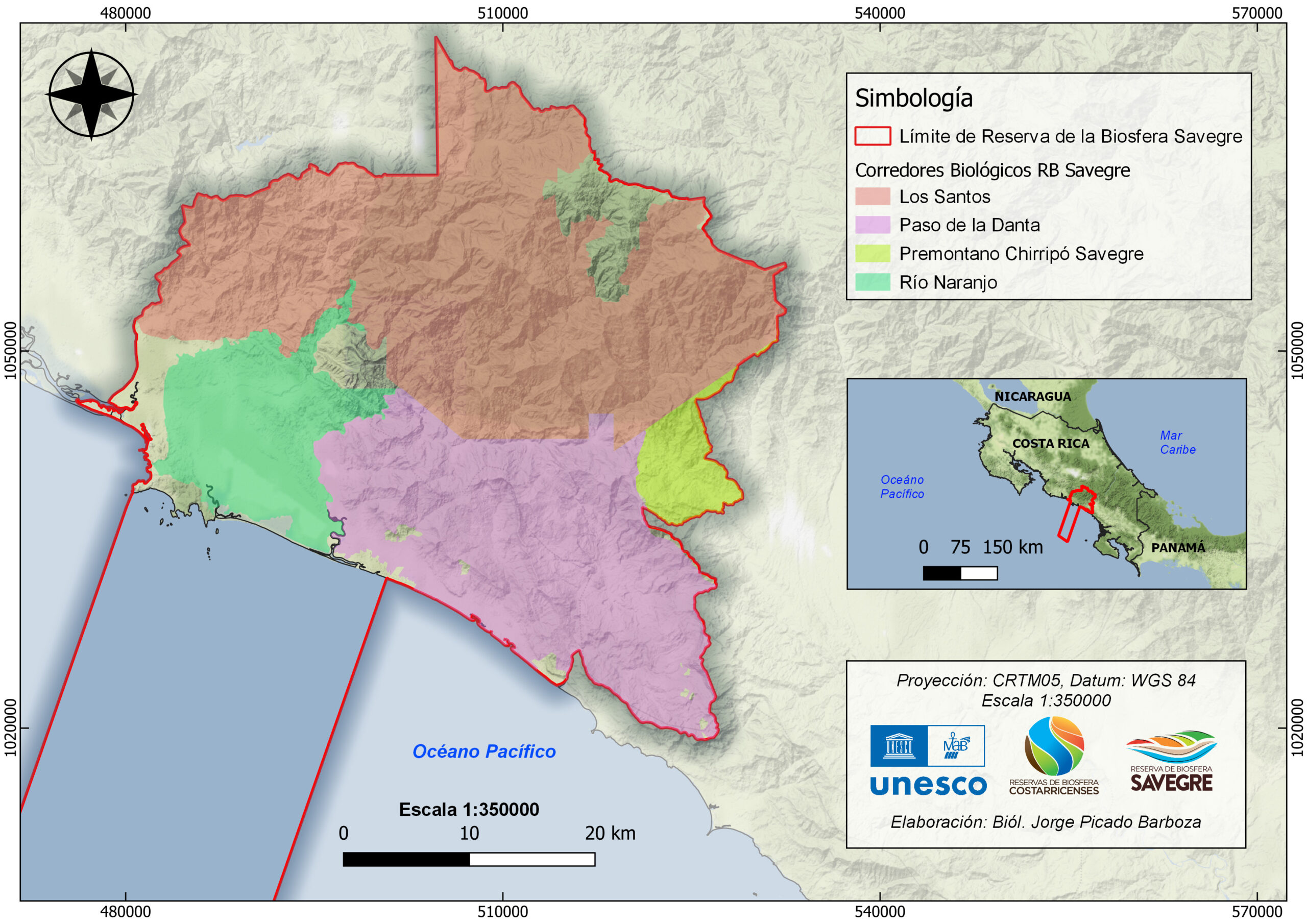 La propuesta final tiene un área total 312914 hectáreas (marinas y terrestres) en el pacífico central costarricense, incluyendo parte del territorio de 4 cantones (Dota, Tarrazú, Pérez Zeledón y Aguirre), 2 áreas de conservación (Pacifico Central y La Amistad Pacifico), un amplio mosaico de áreas silvestres protegidas (Parque Nacional Manuel Antonio, Zona Protectora Cerro Nara, Refugio de Vida Silvestre Mixto Portalon, RVSM Hacienda Barú, Reserva Forestal Los Santos, Parque Nacional Quetzales, Reserva Biológica Cerro Vueltas), incluye 3 corredores biológicos (Paso de la Danta, Río Naranjo y Los Santos) y cuencas hidrográficas tan importantes como Río Paquita, Río Naranjo, Río Savegre y Río Barú. En cuanto a representatividad ecosistémica contiene 8 unidades fitogeografías (desde Paramos de Talamanca hasta llanuras de Parrita), con un rango altitudinal terrestre desde los 0 hasta los 3400 msnm en 48 km lineales. Algunas características especiales es su baja población, alta biodiversidad, calidad y cantidad de recurso hídrico y que las principales actividades económicas (turismo y agricultura) se basan en la riqueza de los paisajes presentes. Los principales poblados son Quepos, Manuel Antonio, Matapalo y San Gerardo de Dota.
